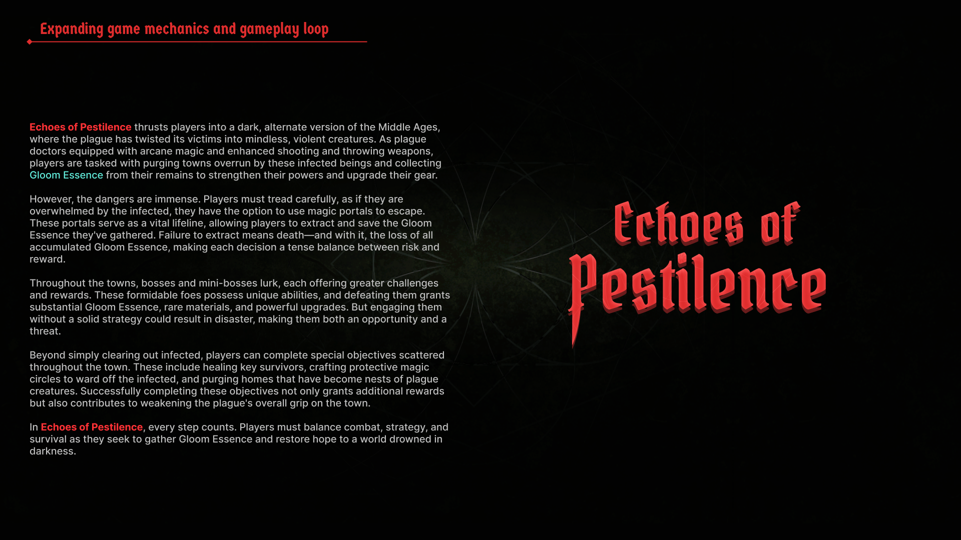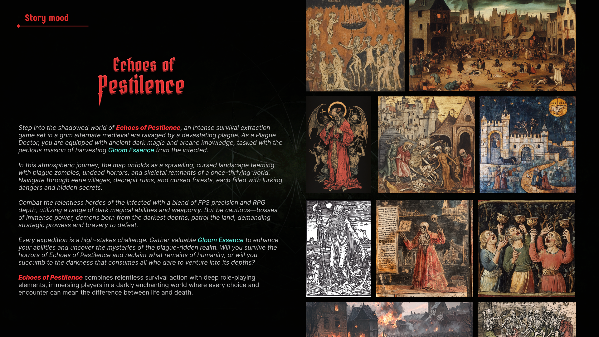 Echoes of Pestilence is a dark fantasy concept set in a world ravaged by plague and corruption. Blending atmospheric storytelling with strategic gameplay, it challenges players to survive, adapt, and uncover the secrets hidden within a bleak, unforgiving landscape.